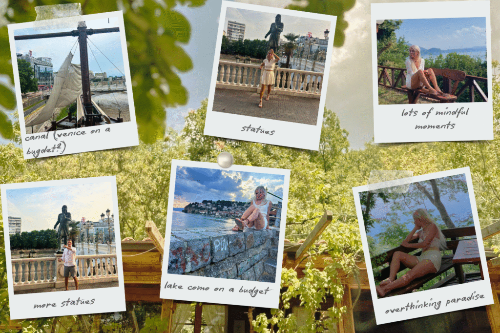 The contrast between Skopje and Ohrid matters. Skopje holds the bus stations, traffic, smokey bars and visual overload; it is where you arrive, figure out tickets and maybe feel your anxiety spike. But don’t worry, walking by the canal is sensory overload cure. The town has always nice cultural activities with lots of street artists. Ohrid is where your shoulders drop.